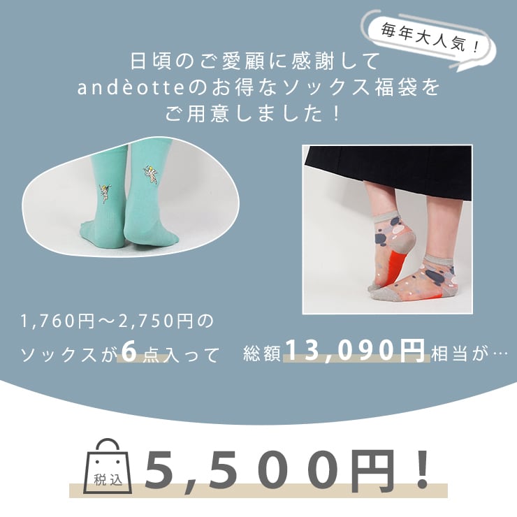 2026福袋 ソックス 6点セット 【13,090円相当 1月5日以降発送】ande アンデ (レディース 女性 靴下 柄 北欧 雑貨 かわいい おしゃれ オシャレ ブランド 正月 新春 お楽しみ袋 セット アソート 福袋)