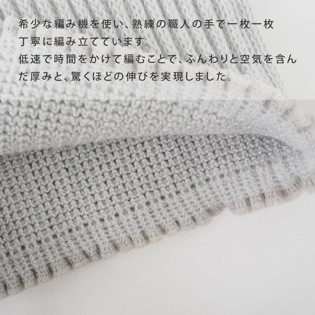 低速で時間をかけて編むことで、ふんわりと空気を含んだ厚みと、驚くほどの伸びを実現。