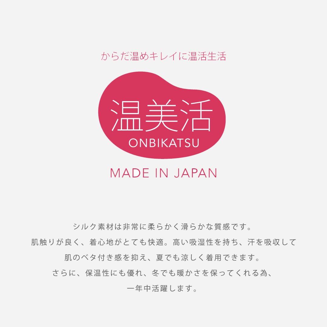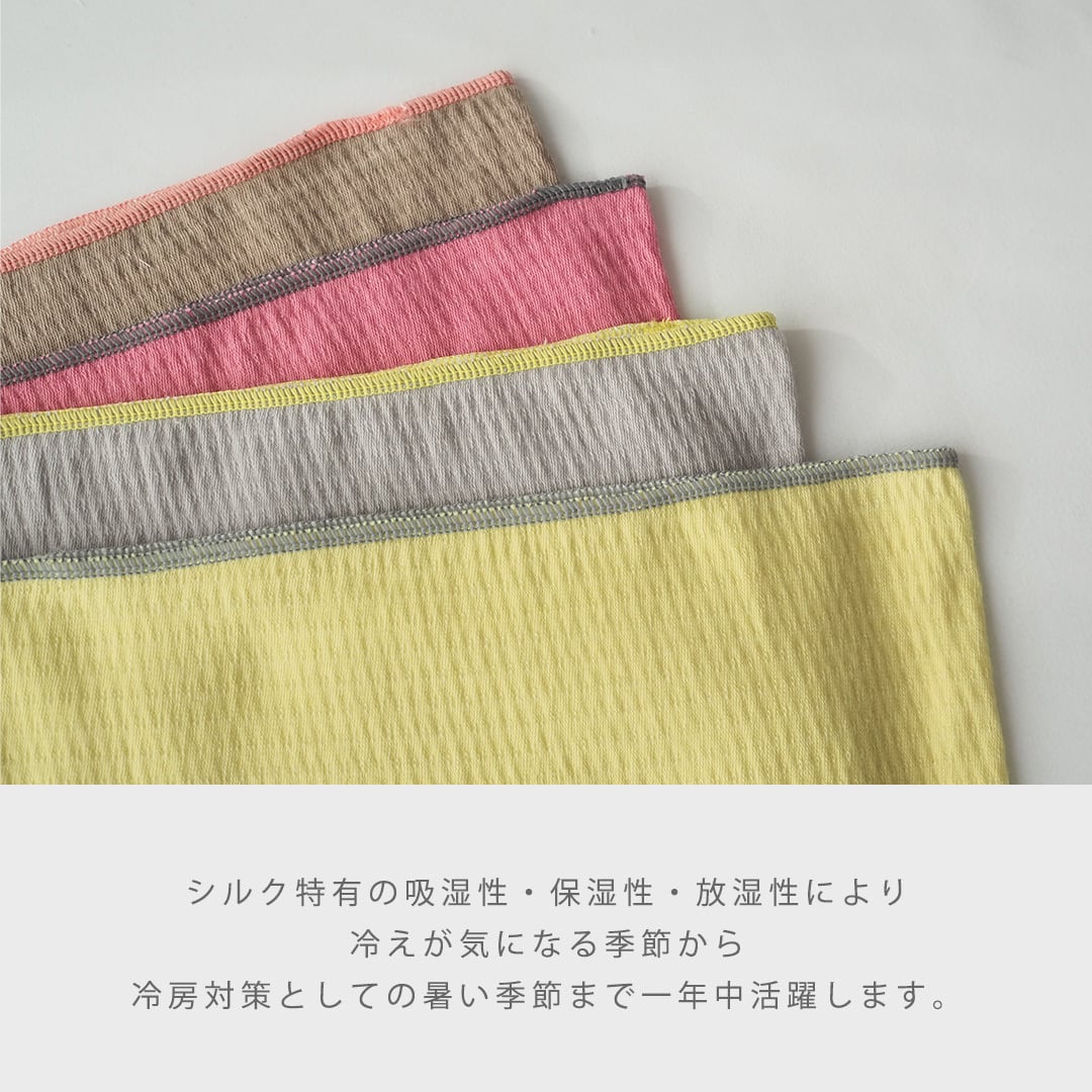 表生地と裏生地の間に空気の層があるので程よい保温性が 生まれ、シルク特有の吸湿性・保湿性・放湿性により冷えが気になる季節から冷房対策としての暑い季節まで一年中活躍します。
