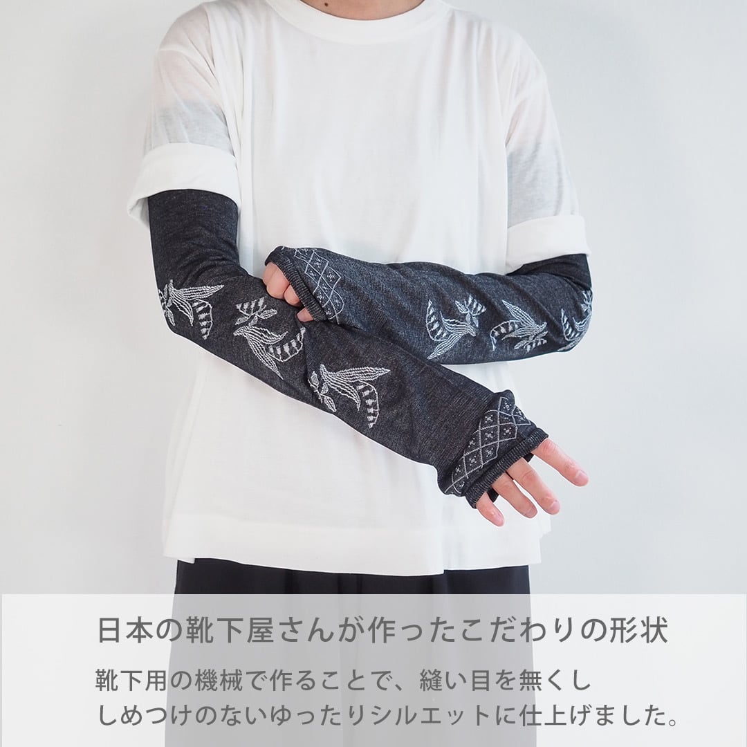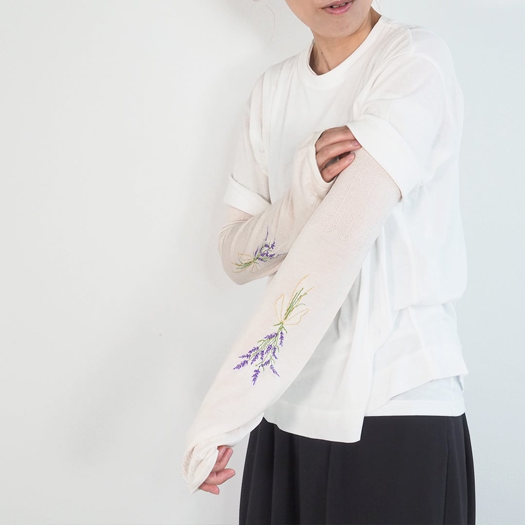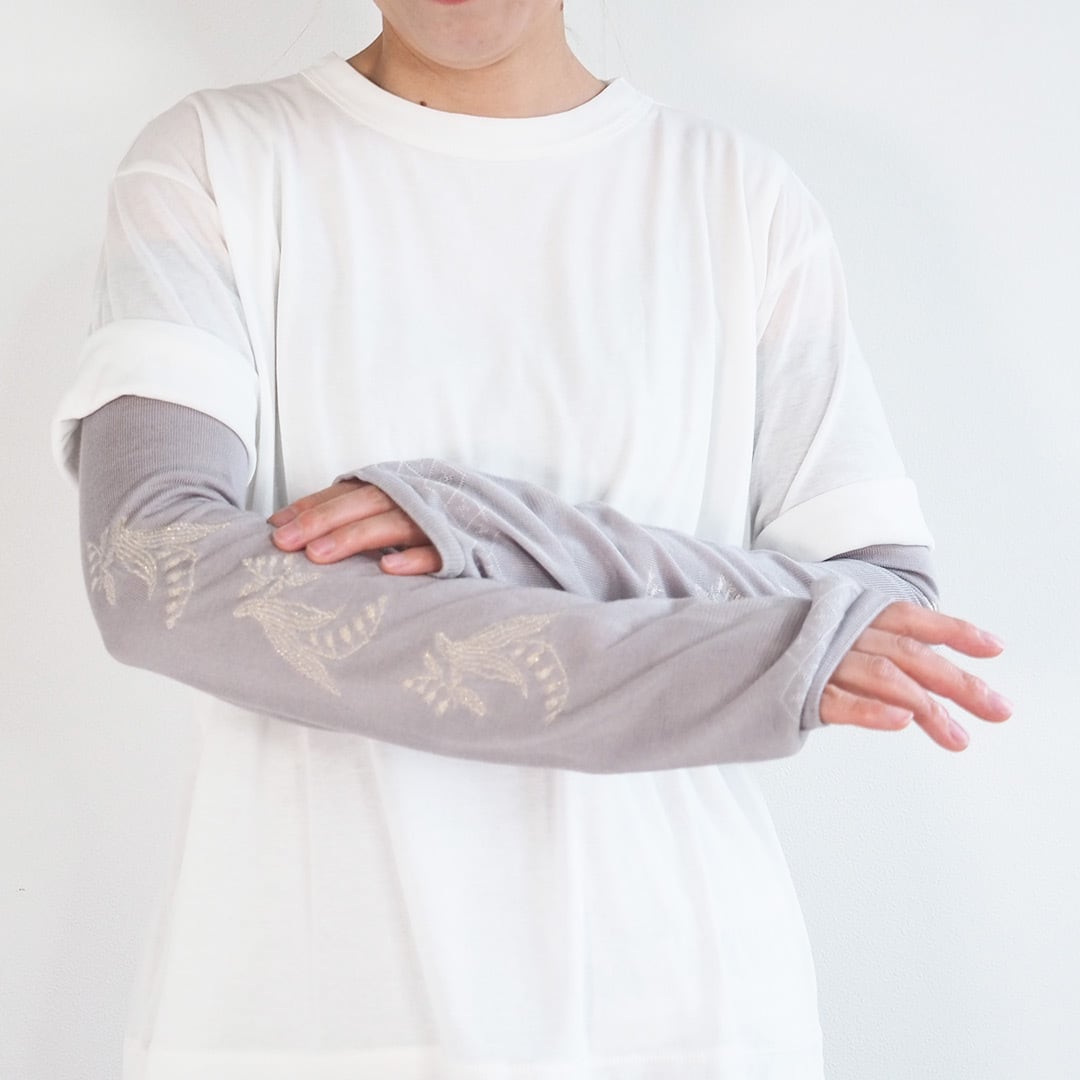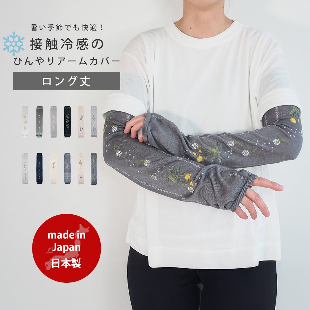いつものおでかけに。ひんやり素材のアームカバーのロング丈。靴下の工場さんで作っているので接ぎ目のない快適な着け心地に仕上がっています。