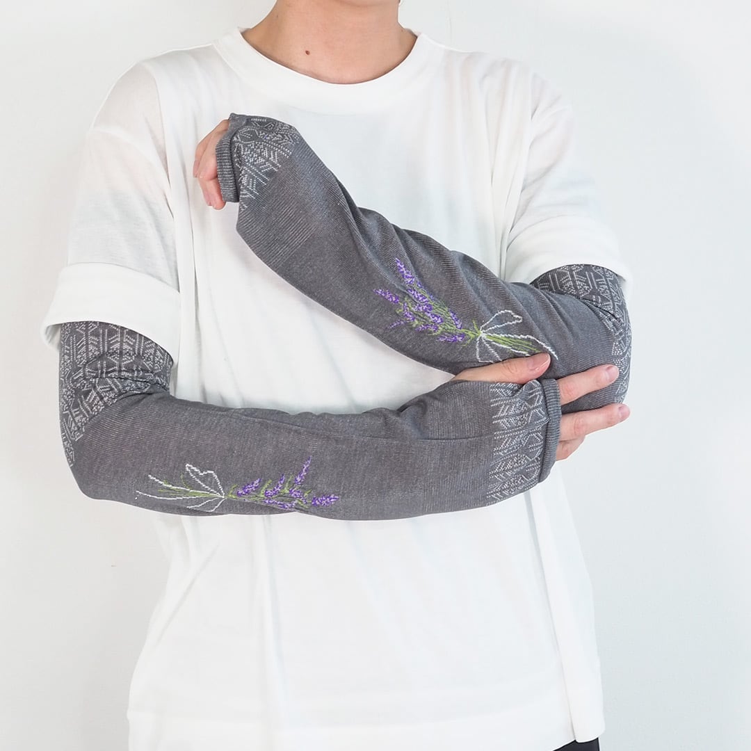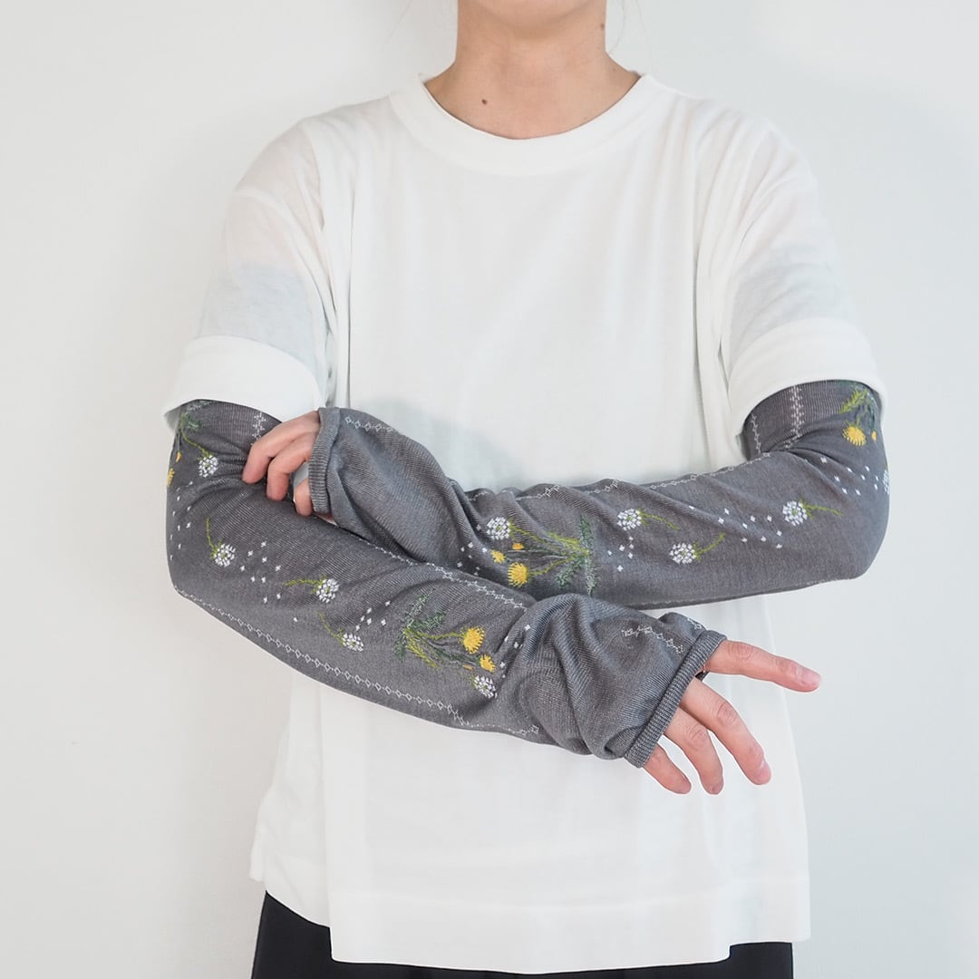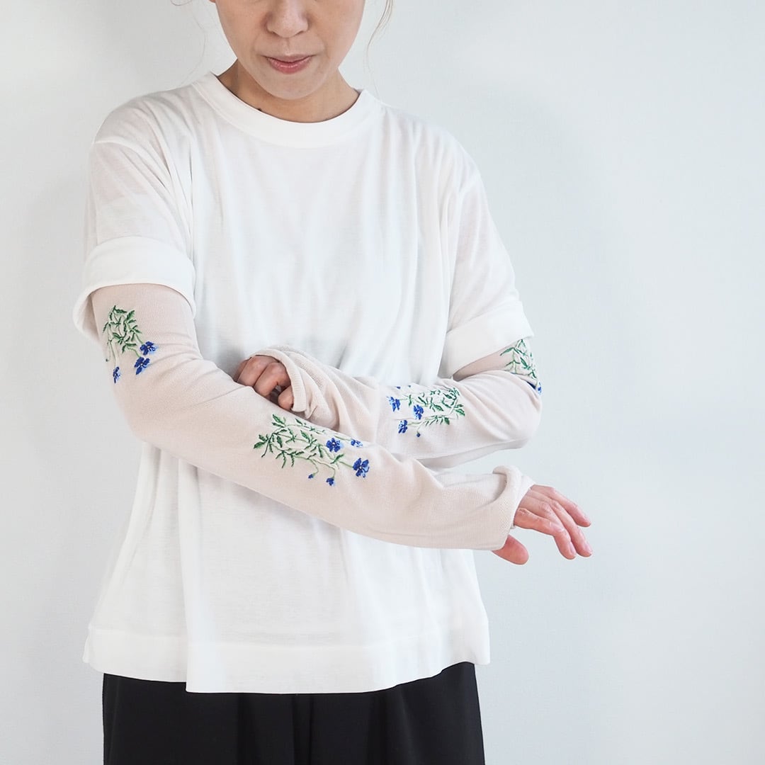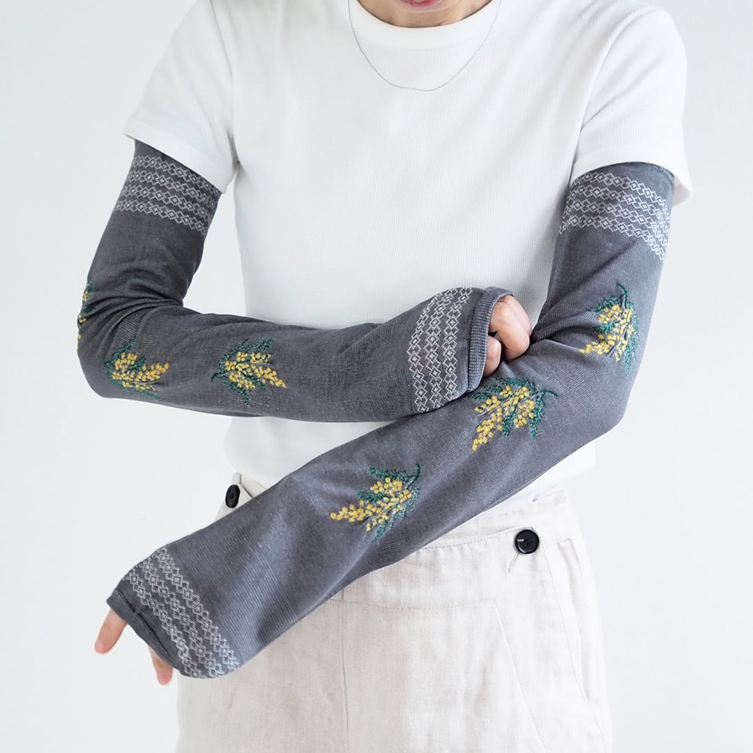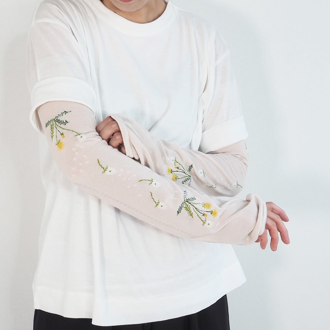 いつものおでかけに。ひんやり素材のアームカバーのロング丈。靴下の工場さんで作っているので接ぎ目のない快適な着け心地に仕上がっています。