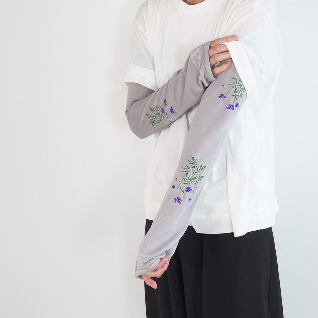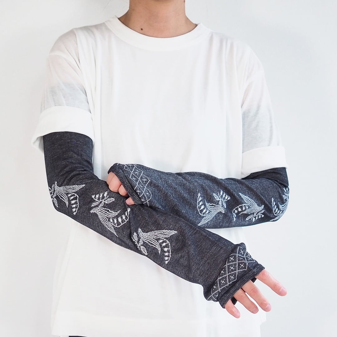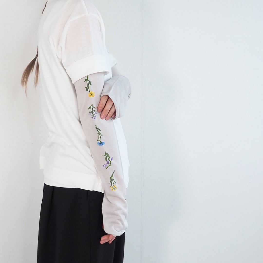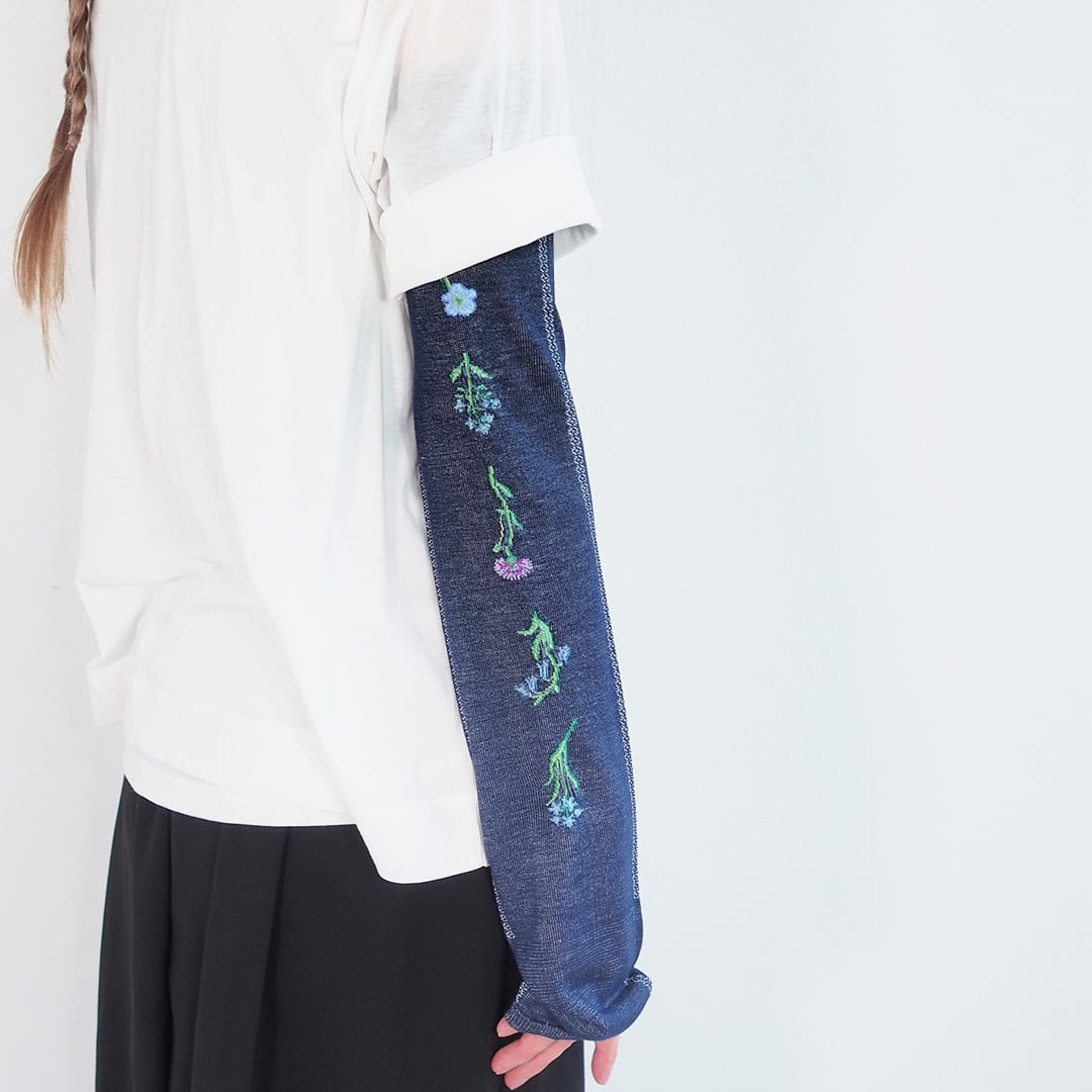 いつものおでかけに。ひんやり素材のアームカバーのロング丈。靴下の工場さんで作っているので接ぎ目のない快適な着け心地に仕上がっています。