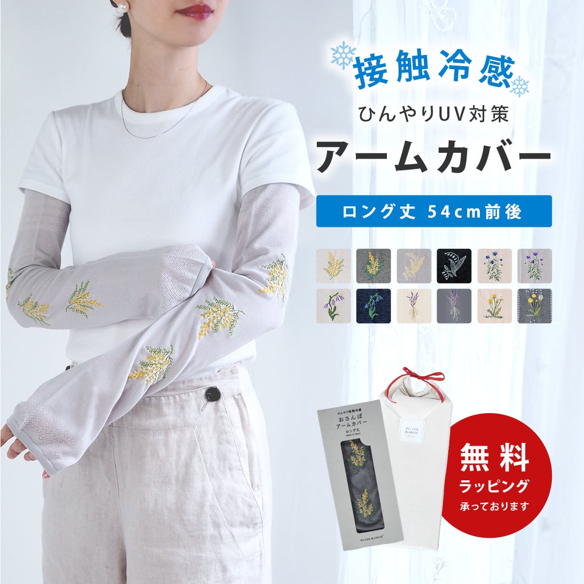 *ご購入の際はこちらのページをご確認いただきますようお願いいたします。 https://mblanche.thebase.in/about 【商品説明】 いつものおでかけに。ひんやり素材のアームカバーのロング丈。靴下の工場さんで作っているので接ぎ目のない快適な着け心地に仕上がっています。 肌に触れる内側には、接触冷感効果のある糸を使用しているので、涼やかに腕全体をしっかり紫外線から守ります。ペットのおさんぽや、ジョギングに。 【サイズ】 フリー(約54cm前後※柄によって異なる場合があります。) 【素材】 5712003003,04: レーヨン、ポリエチレン、シルク、ポリエステル 5712003009,10,11,12: レーヨン、ポリエチレン、シルク、ナイロン、ポリエステル その他: レーヨン、ポリエチレン、シルク、ナイロン 【生産国】 日本製 【商品に関して】 ●ラッピング承ります。 ●手洗いの際は中性洗剤をご使用ください。 ●濃色の製品は多少色落ち移染場合があり、単独でのお洗濯をお勧めいたします。 ●着用や着脱の際、爪などの引っ掛かりにご注意ください。 【その他のアームカバー】 https://mblanche.thebase.in/categories/1395568 【配送先が沖縄・離島の方は5000円(税抜き)以上でも送料無料サービスが適応になりません。こちらで送料を追加してください】 https://mblanche.thebase.in/categories/2719009