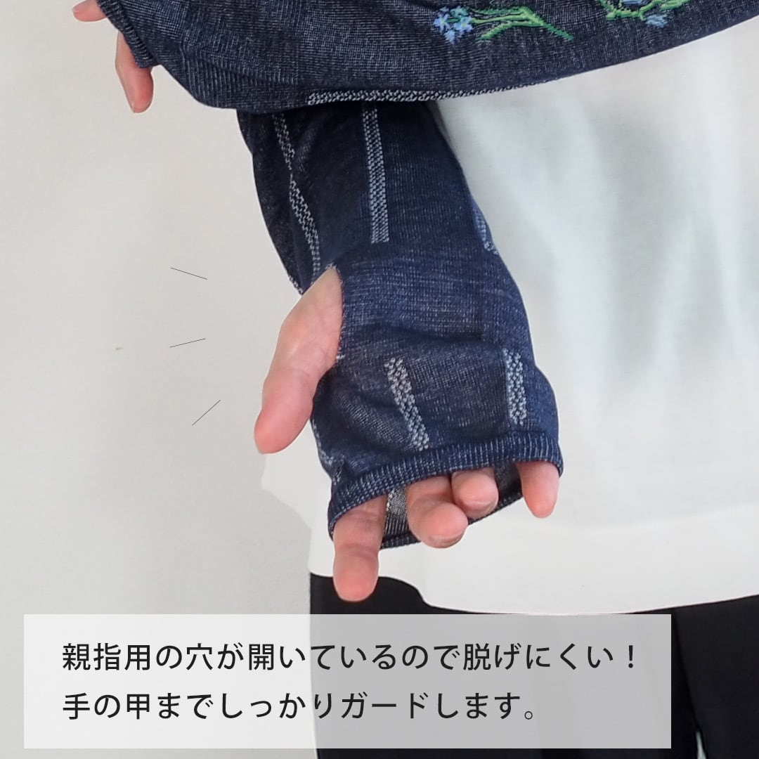 肌に触れる内側には、接触冷感効果のある糸を使用しているので、涼やかに腕全体をしっかり紫外線から守ります。ペットのおさんぽや、ジョギングに。