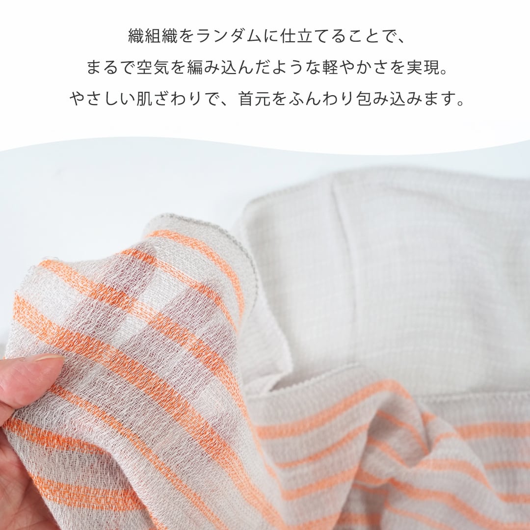 泉州の職人技が光るこのシリーズは、織り組織をランダムに仕立てることで、まるで空気を編み込んだような軽やかさを実現。タオルのような優しい肌ざわりで、首元をふんわり包み込みます。軽くて、やわらかくて、心地いい。お散歩や旅のお供にぴったり。UVカット加工もしているので、気になる首回りを紫外線から守ります。