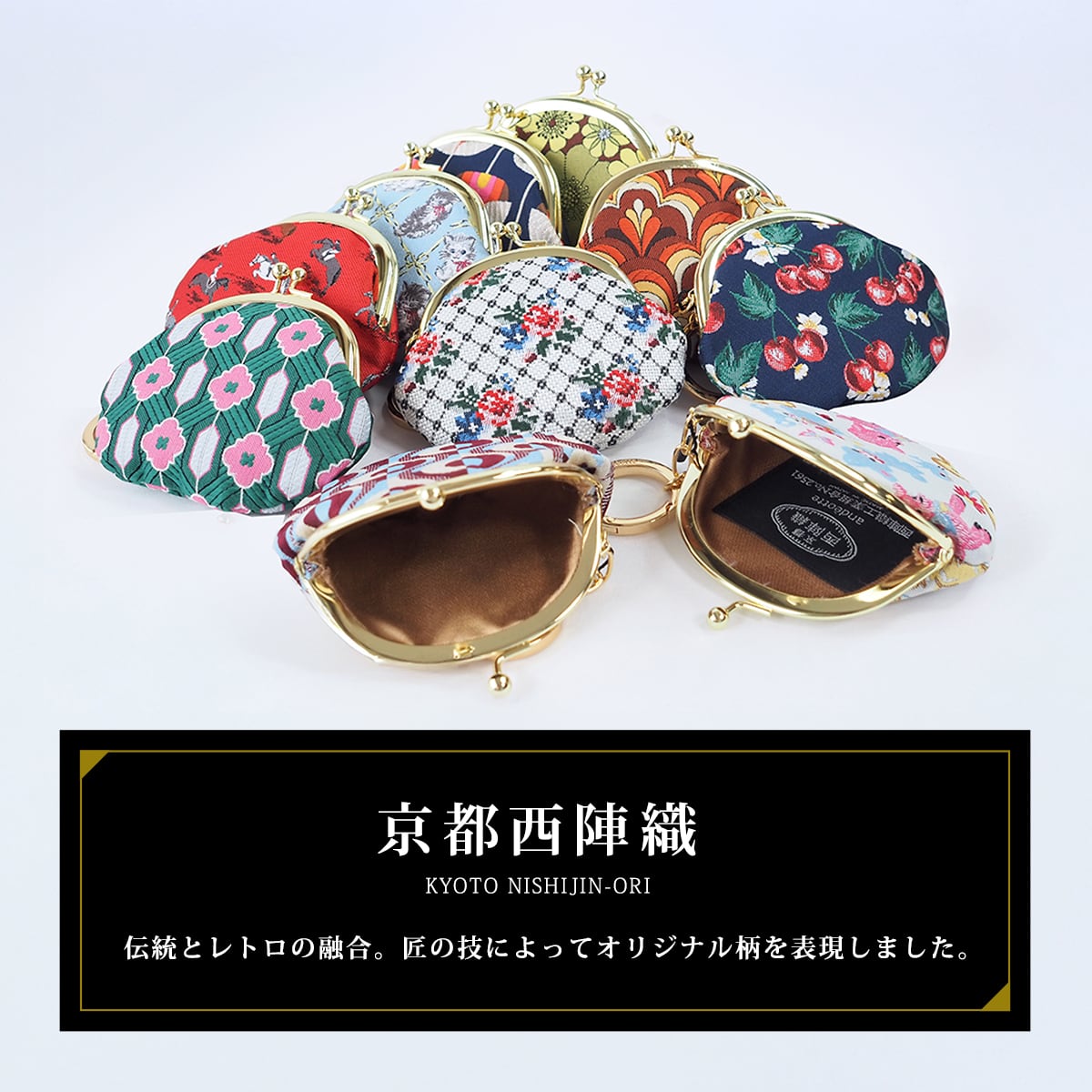 京都 西陣織 がま口 チャーム ポーチ 2016 andèotte アンデオッテ (母の日 ギフト プレゼント 手のひらサイズ カラビナ付き 日本製 小物入れ コンパクト 整理整頓 かわいい おしゃれ 総柄 誕生日 ギフトボックス付き)