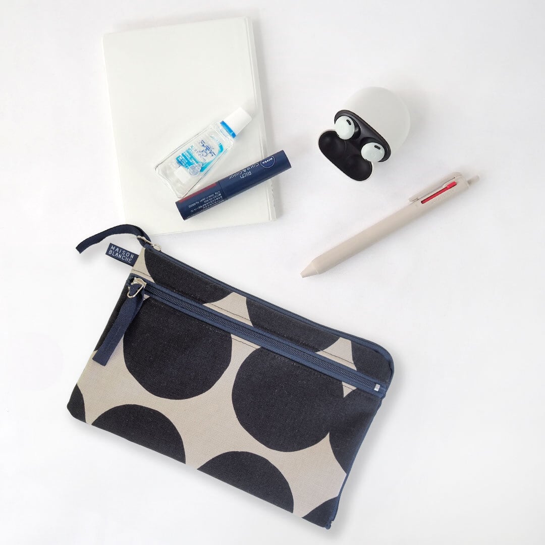 L字のファスナーが使い勝手の良いマチなしのフラットポーチです。