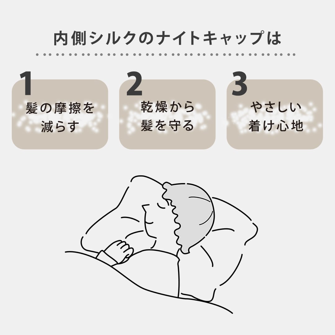 髪にやさしいなめらかなシルク面が寝ている間の寝具との摩擦からやさしく髪を守ります。